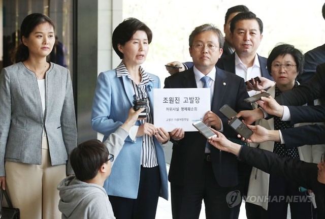 더불어민주당 송기현 법률위원장(오른쪽 두번째), 백혜련 의원(오른쪽 세번째), 김현 대변인(맨 오른쪽)이 3일 오전 서울 서초동 서울중앙지검에서 대한애국당 조원진 대표에 대해 명예훼손 혐의로 고발장을 접수하기에 앞서 고발 취지를 설명하고 있다.