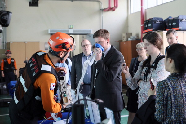덴마크 민간화재연구소(DBI) 연구원 14명이 4차 산업혁명 관련 서울 재난대응체계 정보 공유를 위해 최근 서울 은평소방서를 방문했다. 사진은 덴마크 연구원이 구조·구급 장비를 착용해 보는 모습.(사진제공=은평소방서)