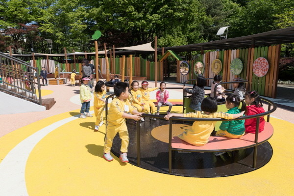 서울 양천구가 양천공원에 새 놀이터를 완공하고 지난 4일 준공식을 열었다. 사진은 아이들이 4일 오전 서울시 양천구 양천공원 쿵쾅쿵쾅 꿈마루 놀이터에서 진행된 ‘양천공원 쿵쾅쿵쾅 꿈마루 놀이터 준공식’에서 놀이터 체험을 하고 있는 모습.(사진제공=양천구청)