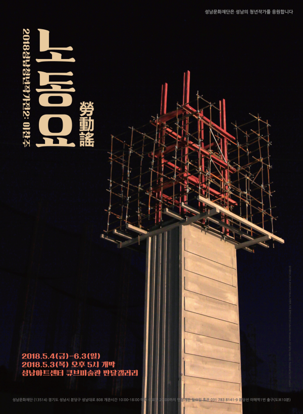 2018 성남청년작가전의 두 번째 주인공 이찬주 작가는 ‘노동요(勞動謠)’라는 제목의 전시로 자신의 세계를 공유한다. 이찬주 작가의 초기작은 공사 중인 골조나 비완성된 구조물 등 직접적인 모티프를 띄고 있다면, 그 후 <공사중-빌딩>(2017), <우리집 시리즈>(2017) 등과 같이 ‘집’이나 ‘건물’ 등 확대된 공간으로 접근하기 시작했다.