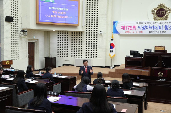 [인천=문찬식 기자] 인천시의회 주관으로 최근 열린 의정아카데미 제179회 청소년 의정교실에 서구 가좌4동 소재 동인천여자중학교 학생 32명이 참가했다.
