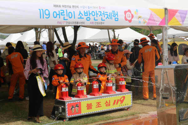 경기 안성소방서는 지난 5일 안성맞춤랜드에서 열린 어린이날 행사 ‘다같이 놀자! 뛰자! 즐기자!’에 참가해 ‘소방안전 체험교실’을 운영했다. 사진은 체험교실에 참여한 어린이들이 소화기 활용 체험을 하는 모습. (사진제공=안성소방서)
