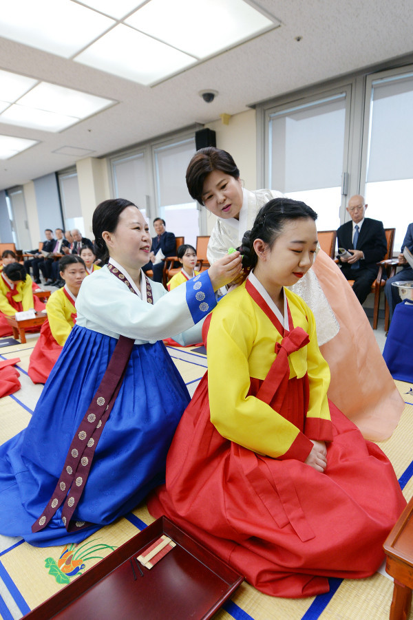동대문구가 지난 12일 구청에서 ‘제9회 동대문구 전통 성년례’를 열었다. ‘성년례’는 사람이 살아가며 치르는 관혼상제(冠婚喪祭) 가운데 ‘관(冠)’에 해당하는 첫번째 통과의례이다. 사진은 김승현 동대문구 여성단체연합회장이 성년례 참가자에게 비녀를 꽂아주고 있는 모습. (사진제공=동대문구청)