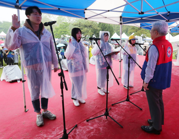 지난 12일 용산 가족공원에서 대한적십자사 서울시지사가 주최하는 ‘제8회 청소년 자원봉사 페스티벌’이 개최됐다. 사진은 이날 행사에 참여한 RCY 단원들이 단원 맹세를 하고 있는 모습. (사진제공=대한적십자사 서울시지사)