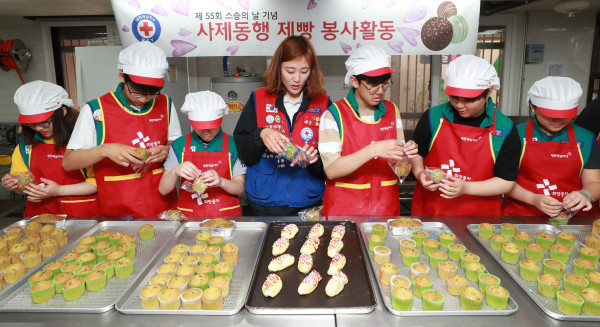 스승의 날을 하루 앞둔 14일 오후 서울 적십자사 구로 봉사나눔터에서 열린 사제동행 제빵 봉사활동에서 서울지역 RCY(Red Cross Youth, 청소년 적십자) 단원들이 선생님과 함께 지역 취약계층에게 전달할 빵을 만들고 있다.