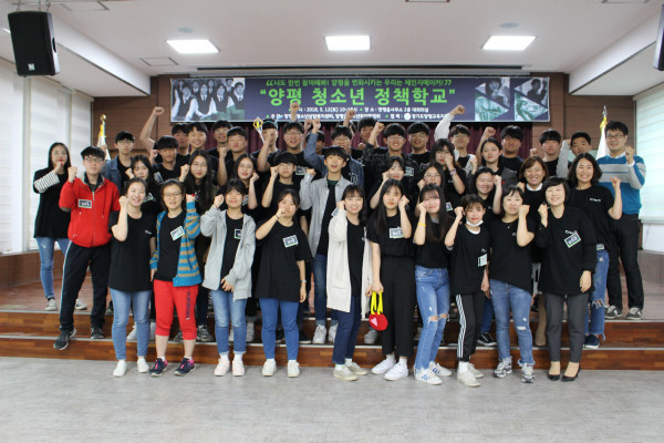 경기 양평군 청소년상담복지센터는 지난 12일 양평읍사무소에서 지역내 청소년 및 학부모 50여명을 대상으로 ‘양평군청소년정책학교’를 개최했다. 사진은 청소년정책학교에 참여한 참가자들이 기념촬영을 하는 모습. (사진제공=양평군청)