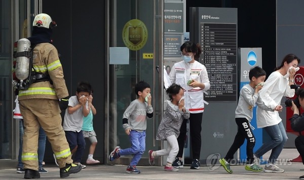 14일 서울 중랑구 서울의료원에서 열린 재난대응안전한국훈련에서 어린이들이 대피 훈련을 하고 있다.
