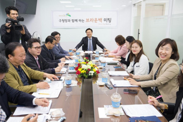 은평구가 구청장과 중간관리자, 실무담당 직원이 함께 모여 구정 현안에 대해 자유롭게 토론하는 ‘브라운백 미팅’을 오는 24일까지 부서별로 개최한다. 사진은 최근 진행된 '브라운백(Brown Bag) 미팅’에서 토론을 하고 있는 구청장과 구청직원들의 모습. (사진제공=은평구청)