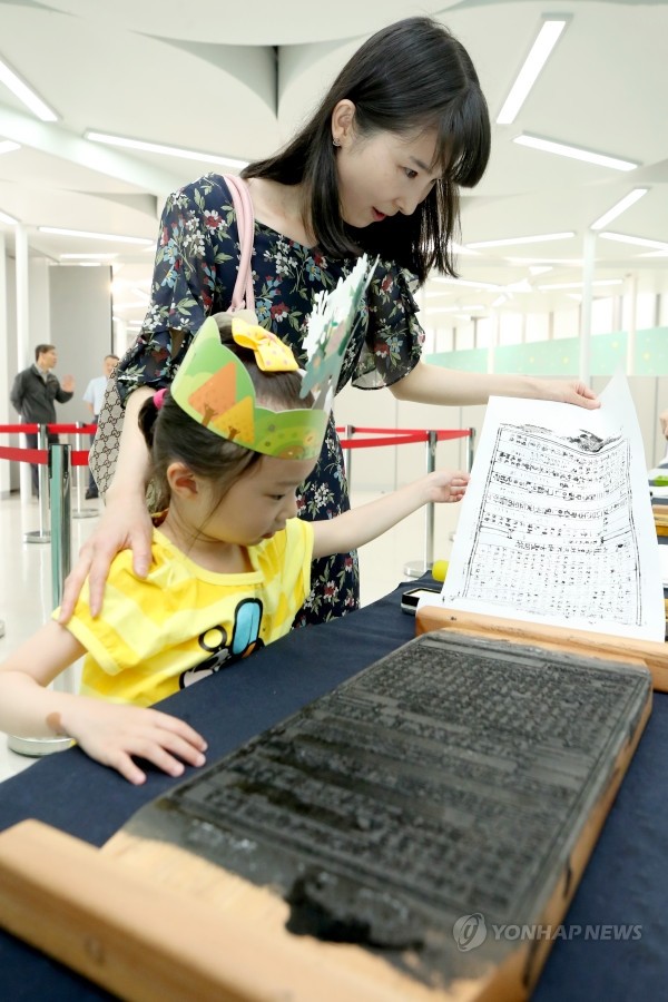 15일 서울 용산구 국립한글박물관에서 열린 제621돌 세종대왕 탄신일 기념 '세종, 함께 걷다' 문화행사를 찾은 어린이들이 훈민정음 목판인쇄 체험을 하고 있다.