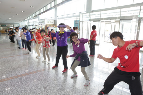 최근 금천구는 할머니들이 제2의 인생을 주체적으로 살아갈 수 있도록 지원하는 할머니학교에서 ‘나이는 없다, 잘 늙어간다는 것’을 주제로 파쿠르 특강을 진행했다. 사진은 할머니학교 학생들이 구청 로비에서 대만 코치에게 파쿠르식 이동방법을 배우고 있는 모습. (사진제공=금천구청)