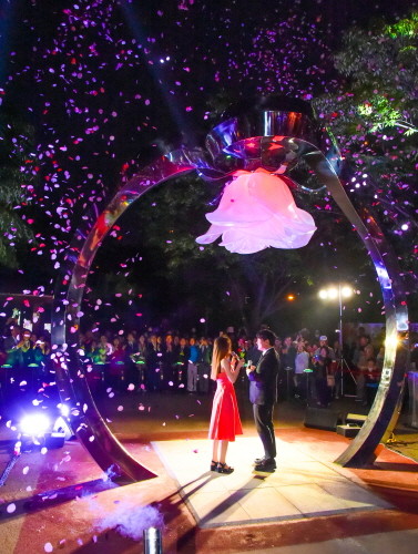 | ▲ 지난 11일 수림대장미정원에서 장미축제 상징조형물 ‘사랑의 온도’ 의 제막을 축하하는 뮤지컬 듀엣공연이 진행되고 있다.(사진제공=중랑구청) | ||