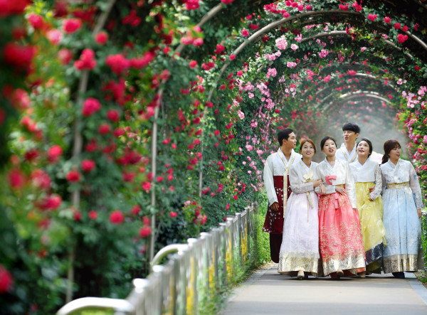 | ▲ 한복을 입고 장미터널을 걷고 있는 구청 직원들의 모습. (사진제공=중랑구청) | ||