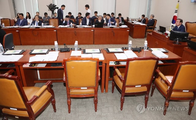 16일 오전 산업통상자원중소벤처기업위원회 회의실에서 야당 의석이 비어 있다. 이날 장병완 위원장은 산자위 전체회의에서 국회의장의 심사 기일 지정에 반대하며 회의를 산회했다.