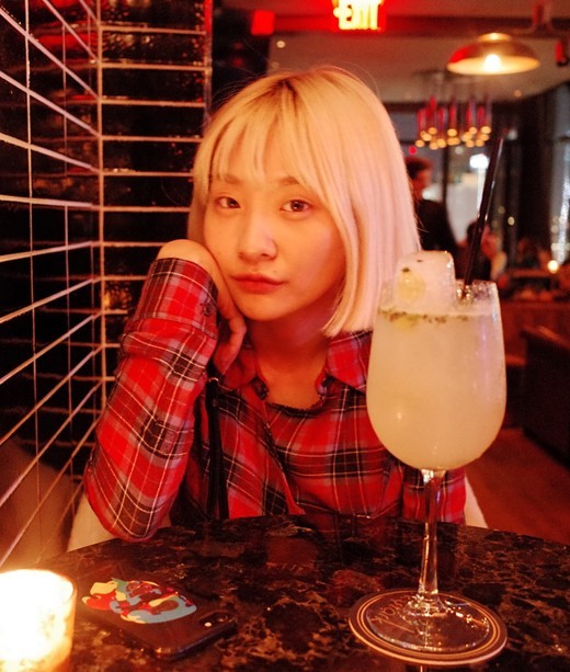 붉은 색 체크무늬 셔츠 차림의 안지영이 칵테일을 앞에 두고 턱을 괸 채 포즈 취하고 있다. 또한 화장기 없는 민낯으로 시크한 눈빛을 보내고 있다.