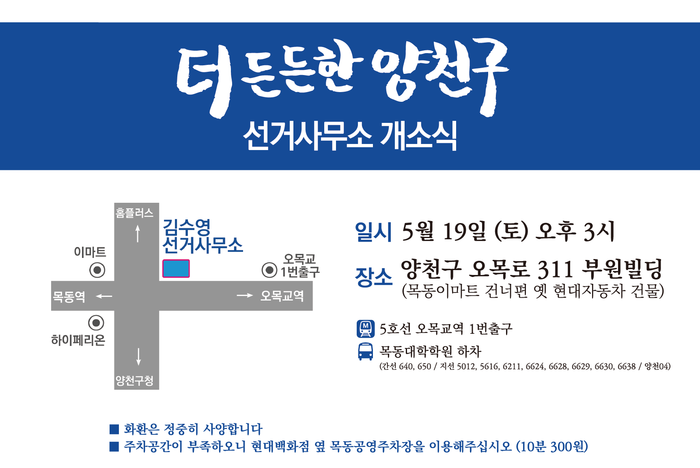 한편 김 후보는 오목교역 부원빌딩에 선거사무소를 차릴 예정이며, 개소식은 오는 19일 오후 3시부터 진행할 예정이다.