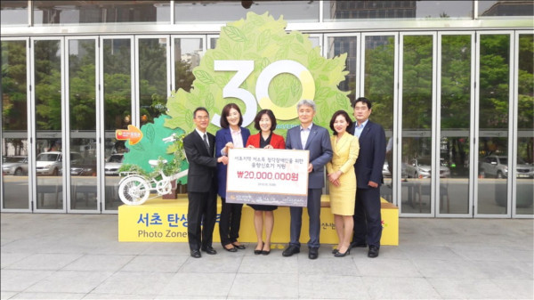 지난 15일 국민은행 서초지역영업그룹이 서울 서초구청에 청각장애인 음향표시장치지원을 위한 후원금 2000만원을 전달했다. 사진은 후원금 전달식 후 기념촬영을 하고 있는 관계자들의 모습. (사진제공=서초구청)