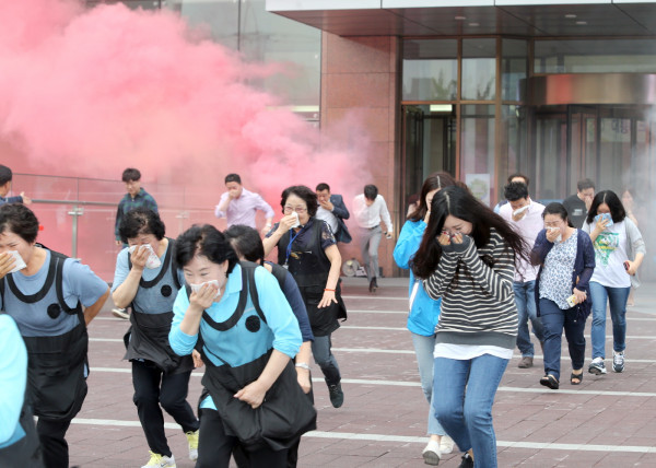금천구는 최근 가산동 소재 대륭테크노타운 18차에서 ‘2018년 안전한국훈련’과 연계해 재난대응 훈련을 실시했다. 사진은 주민들이 화재대피 훈련을 하고 있는 모습. (사진제공=금천구청)