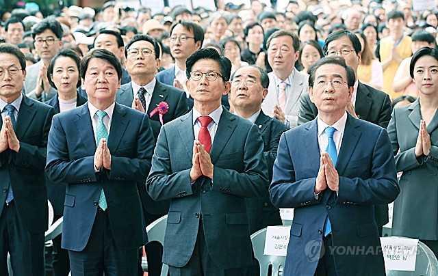 부처님오신날인 22일 오전 서울 종로 조계사에서 열린 봉축법요식에서 더불어민주당 박원순 서울시장 후보(오른쪽부터)와 자유한국당 김문수 서울시장 후보, 바른미래당 안철수 서울시장 후보가 합장하고 있다.