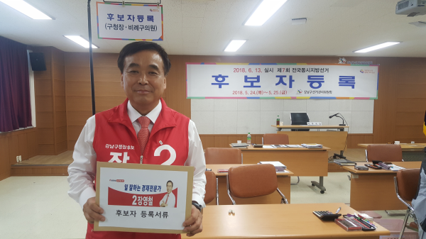 | ▲ 강남구선거관리위원회를 찾아 강남구청장 후보등록을 하는 장영철 후보 | ||