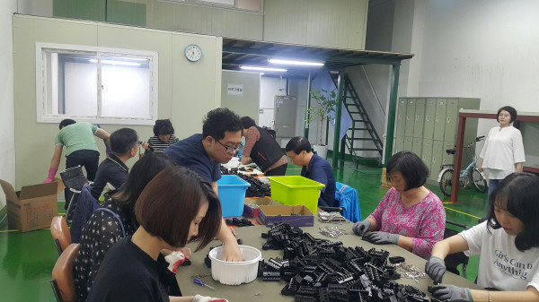 경기 김포시차량등록사업소는 지난 26일 느티나무 직업재활시설을 찾아 후원물품 전달과 함께 장애인근로자 일손돕기에 힘을 보탰다. 사진은 참여자들이 직접 직업재활 활동을 해보고 있는 모습. (사진제공=김포시청)