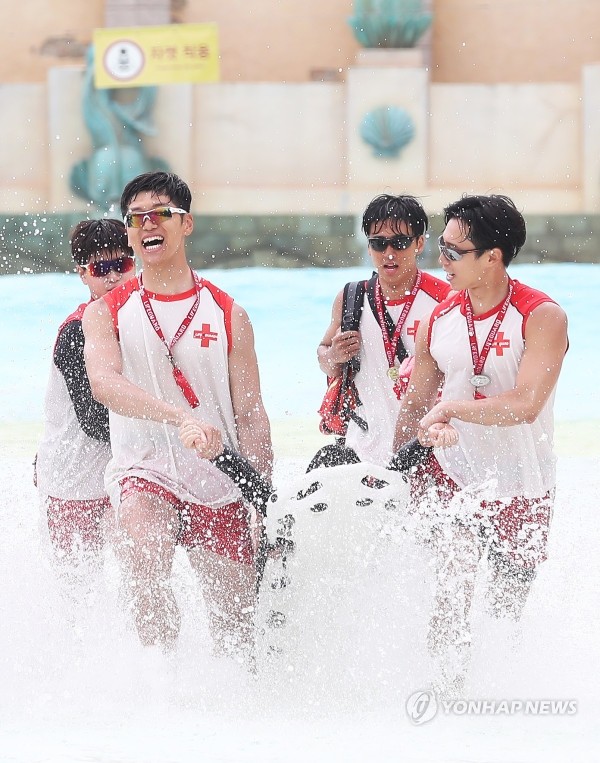 29일 오전 경기도 용인시 캐리비안베이에서 인명구조 요원들이 익수자 구조훈련을 하고 있다.