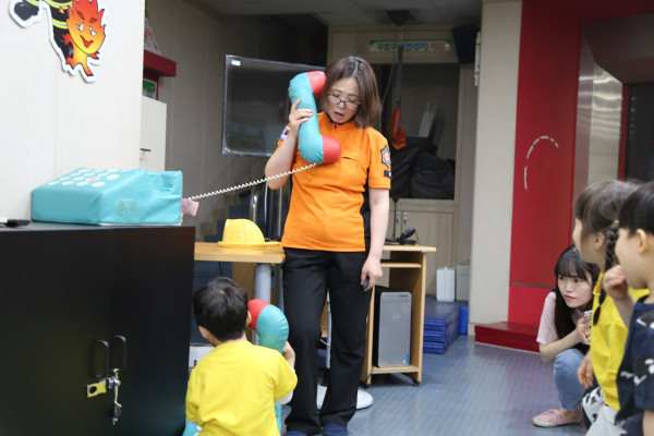 서울 영등포소방서는 29일 오전 영등포초등학교 병설유치원 원아와 교사를 대상으로 '소방안전교육'을 실시했다. 사진은 소방서 관계자가 어린이들에게 119 신고방법에 대해 설명하는 모습. (사진제공=영등포소방서)