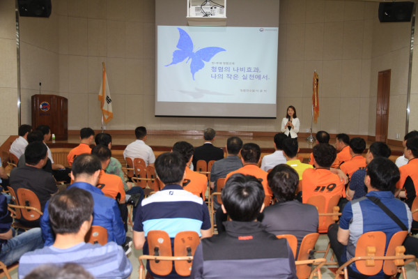 서울 동작소방서는 30일 대강당에서 5월 정례조례 및 청렴 특별 교육을 실시했다고 밝혔다. 사진은 외부강사가 소방서 관계자들에게 청탁금지법, 공직자 행동강령 등에 대해 설명하는 모습. (사진제공=동작소방서)