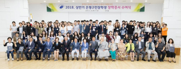 최근 재단법인 은평구민장학재단이 구청 은평홀에서 130여명의 학생과 학부모, 재단 임원들과 함께 ‘2018 상반기 은평구민장학생 장학증서 수여식’을 개최하고, 장학생들에게 장학증서를 전달했다. 사진은 장학금 수여식 후 기념촬영을 하고 있는 수여식 참가자들의 모습. (사진제공=은평구청)