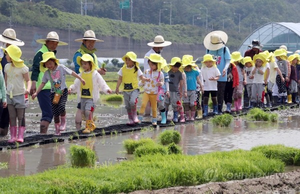 30일 부산 정관읍 예림리에 있는 논에서 열린 농경문화 복원체험 행사에서 어린이들이 전통 손 모내기를 체험하고 있다. 기장군농업경영인연합회와 도시농업공동체는 산업화와 도시화로 잊고 살아온 아름다운 전통농경 문화를 복원해 새로운 관광자원으로 활용하고자 농악놀이, 농요부르기, 새참먹기 등 다양한 체험행사를 마련했다.