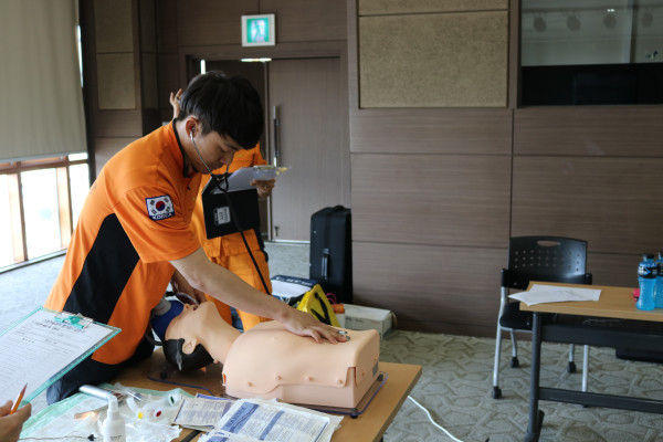 경기 양주소방서는 31일부터 오는 6월4일까지 화재·구조·구급 등의 외근활동을 전담하는 직원을 대상으로 '소방전술훈련 평가'를 실시한다. 사진은 31일 소방관이 구급분야에서 평가를 받고 있는 모습. (사진제공=양주소방서)