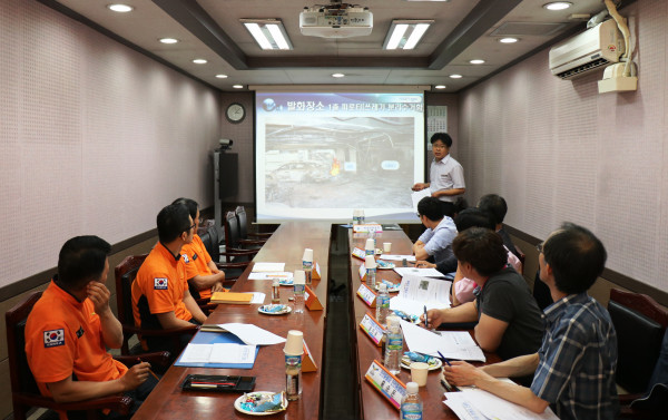 경기 오산소방서는 31일 소방서 2층 소회의실에서 ‘가연성 외장재 사용 건축물 안전대책 마련을 위한 유관기관 관계자 간담회’를 실시했다. 사진은 간담회에 참석한 관계자들이 필로티 건축물 화재 관련 교육을 받고 있는 모습.(사진제공=오산소방서)