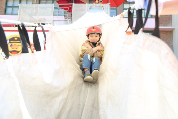 영등포소방서는 지난 1일 오전 영등포동 소재 문래초등학교에서 2학년 학생 150명을 대상으로 이동안전체험차량 119안전체험교실을 진행했다. 사진은 학생이 경사구조대 탈출 체험을 하고 있는 모습. (사진제공=영등포소방서)