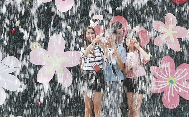 무더운 날씨를 보인 4일 오후 경기도 용인시 에버랜드를 찾은 시민들이 분수 앞에서 사진을 찍으며 더위를 식히고 있다.