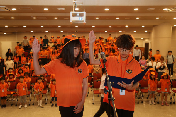 영등포소방서는 보라매 안전체험관에서 소방서별 대표 학급인 영림초등학교 등의 한국119소년단원 및 지도교사 170여명이 참석한 가운데 열린 ‘한국119소년단 발대식’에 참석했다. 사진은 발대식에 참석한 소년단 학생들이 선서를 하고 있는 모습. (사진제공=영등포소방서)
