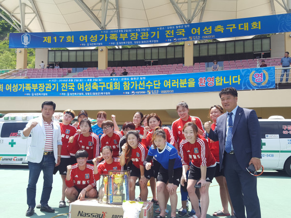 지난 2~3일 양일간에 걸쳐 강원도 철원종합운동장 등 철원군 일원에서 개최된 '제17회 여성가족부장관기 국민생활체육 전국 여성축구대회 1부 리그'에서 수원시 팔달여성축구단이 준우승을 차지했다. 사진은 관계자들이 기념촬영을 하는 모습. (사진제공=팔달구청)