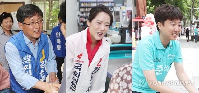 서울 노원병 국회의원 재보궐 선거에 출마한 후보들이 7일 노원구 일대에서 각각 시민들에게 지지를 호소하고 있다. 왼쪽부터 더불어민주당 김성환 후보, 자유한국당 강연재 후보, 바른미래당 이준석 후보.