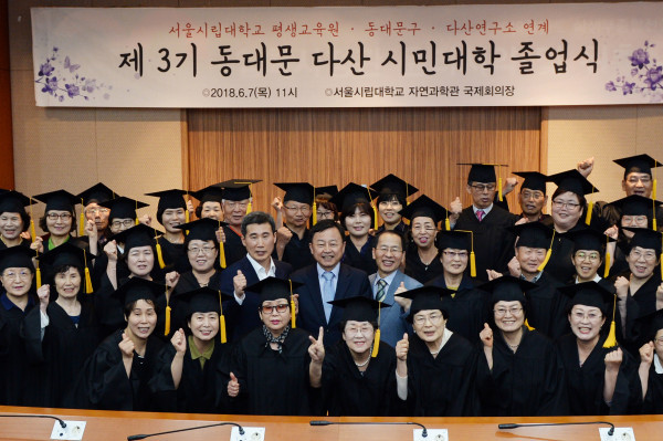 동대문구가 7일 오전 서울시립대학교에서 제3기 ‘동대문 다산시민대학’ 졸업식을 거행하고 졸업생 49명에게 졸업장을 수여했다. 사진은 참여자들이 기념촬영을 하고 있는 모습. (사진제공=동대문구청)