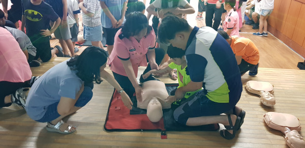 경기 수원시 영통구는 최근 산남초등학교 별관1층 다목적실에서 교사와 학생, 지역 주민 120여명을 대상으로 심폐소생술 등의 민방위 생활안전 교육을 실시했다. 사진은 참여자들이 심폐소생술 실습을 하고 있는 모습. (사진제공=영통구청)