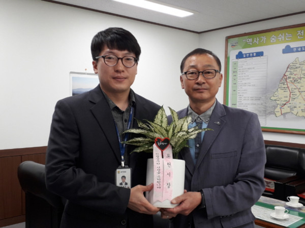 경기 포천시는 최근 ‘5월의 친절공무원’으로 김여정(시민복지과), 이정철(허가담당관), 조광래(군내면사무소), 김진락(신북면행정복지센터) 등 4명의 공무원을 선정했다. 사진은 친절공무원 선정을 기념해 난을 전달받고 있는 조광래씨의 모습. (사진제공=포천시청)