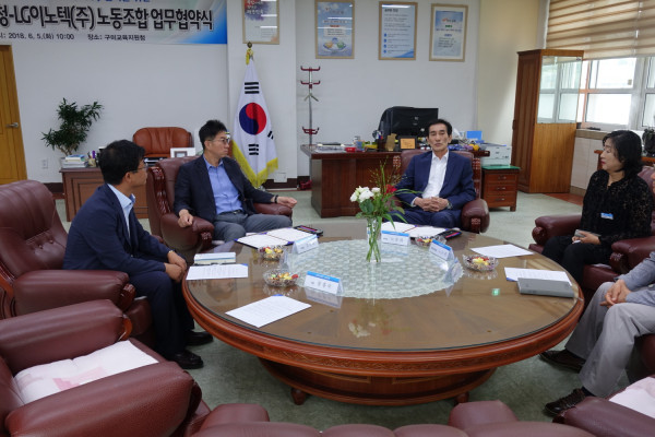 경북 구미교육지원청은 최근교육장실에서 LG이노텍(주) 노동조합과 '행복의 빛 나눔활동' 사업을 위한 업무 협약식을 가졌다. 이번 사업은 지역내 유치원, 초·중·고등학교 중 LG이노텍(주) 노동조합에서 물적·인적기부로 형광등기구가 설치된 학교를 LED등기구로 교체하는 사업이다. 사진은 노승하 교육장 및 관계자들이 이야기를 나누는 모습. (사진제공=구미교육지원청)