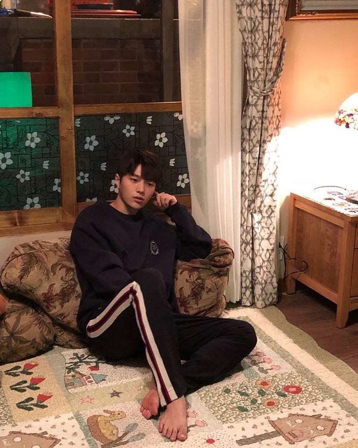 사진 속 김명수는 무심한 듯 자연스러운 표정으로 편한 차림과 맨발을 하고서 앉아있다.