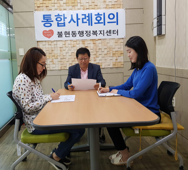 경기 동두천시 불현동 행정복지센터는 12일 오전 사례관리 가구의 복지욕구 해소와 맞춤형 서비스 제공을 위한 내부사례회의를 개최했다. 사진은 센터 관계자들이 회의하고 있는 모습. (사진제공=동두천시청)