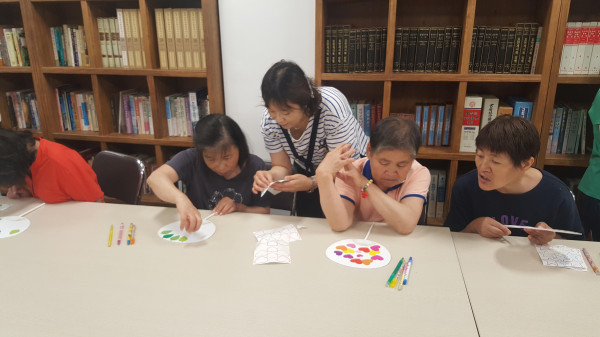 경기 김포시 고촌중학교는 지난 9일 교사 1명, 학부모 6명, 학생 9명이 참석한 가운데 학교 봉사활동 자매기관인 ‘예지원’을 방문해 봉사활동을 실시했다. 사진은 참여자가 장애인들에게 부채 만드는 방법을 알려주는 모습. (사진제공=김포교육지원청)