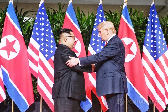 역사적 첫 북미정상회담이 열린 12일 오전 싱가포르 센토사 섬 카펠라호텔에서 미국 도널드 트럼프 대통령과 북한 김정은 국무위원장이 악수하고 있다.