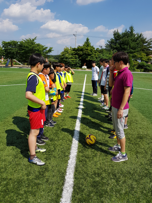 경기 여주가남초등학교는 지난 12일 축구동아리 학생들과 학부모, 교직원을 비롯해 학교 운영위원장 등의 관계자들이 참석한 가운데 ‘사제동행 축구경기’를 진행했다. 사진은 경기에 앞서 참가 선수들이 서로 인사하고 있는 모습.(사진제공=여주교육지원청)