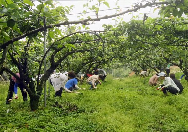 전남 장흥군 장흥읍은 지난 11일 상반기 농촌 일손돕기를 진행했다. 이날 장흥읍 공무원 35명은 장흥읍 금산리 배나무 과수원을 찾아 봄철 농번기 일손 지원에 구슬땀을 흘렸다. 사진은 참여자들이 풀을 베고 있는 모습.(사진제공=장흥군청)