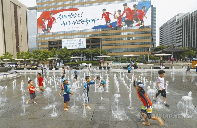 러시아 월드컵 스웨덴전을 하루 앞둔 17일 오후 광화문광장 분수대에서 어린이들이 놀고 있다. 뒤로 월드컵 응원 문구가 보인다.