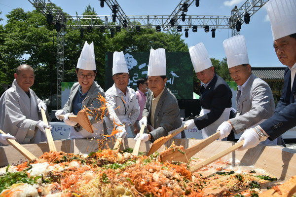 경기 남양주시가 지난 16~17일 봉선사 및 국립수목원, 문화재청동부지구관리소(광릉) 등의 후원을 받아 진행한 ‘제13회 광릉 숲 축제’를 성황리에 마무리했다. 사진은 시에서 생산된 유기농 채소로 만든 비빔밥을 시민과 나누는 '비빔밥 퍼포먼스'가 진행 중인 모습. (사진제공=남양주시청)