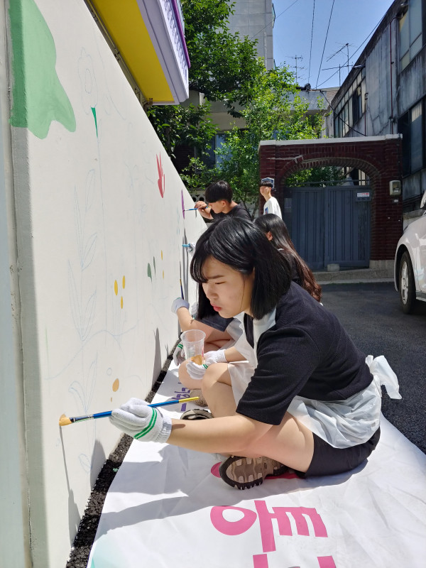 강동구가 최근 아동자치센터 ‘꿈미소 2호점’(구립강암경로당 2층ㆍ구천면로47가길 45) 개소를 기념해 ‘벽화 그리기 이벤트’를 개최했다. 사진은 꿈미소 2호점 벽에 벽화를 그리고 있는 성덕고등학교 미술동아리 'ARTY' 회원들의 모습. (사진제공=강동구청)