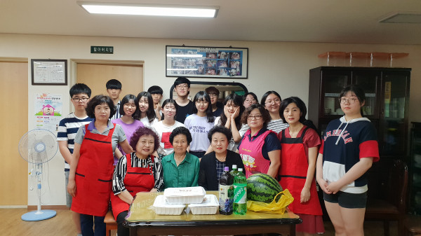 노원구 월계1동 주민센터는 지난 16일 ‘행복 더함 먹거리 나눔행사’를 개최하고, 직접 마련한 부침개와 수박 등을 청소년 자원봉사자들과 함께 지역내 경로당 노인들에게 전달했다. 사진은 나눔활동에 참여한 청소년 등 관계자들이 기념촬영을 하는 모습. (사진제공=노원구청)